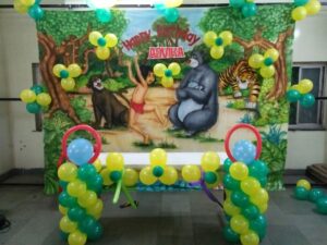 Party box flashes on you through the services as —Balloon arches, eye-catching Pillars, balloon clusters on the ceiling, table decorations, theme based backdrops, theme based cutouts, musical candles, live cartoon character, tattoo maker, party bombs, name in tharmacol and many more. Also we provide Monginis Cake, Coupon Activity, Mini sound system, Photography – softcopy.